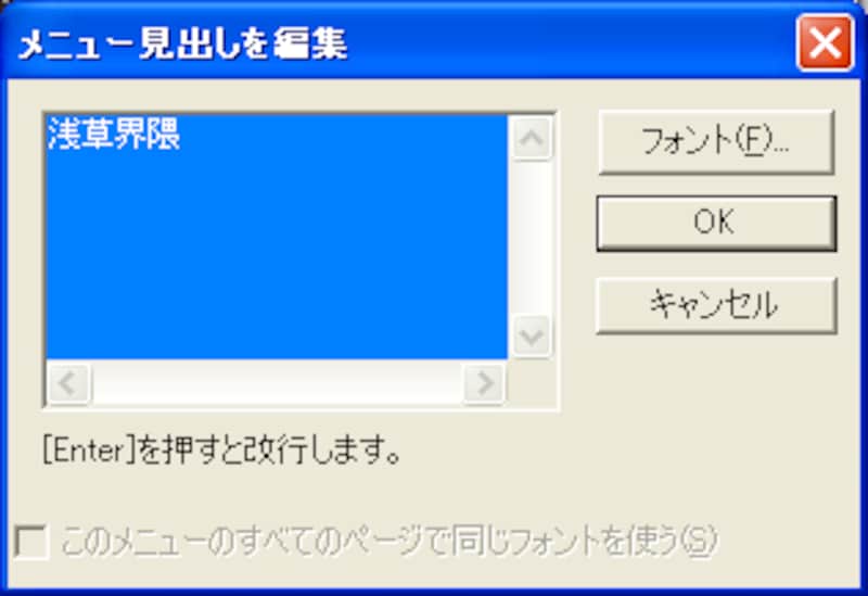 「My Tytle」と表示されているタイトル部分をクリックすると、メニュータイトルを編集する「メニュー見出しを編集」ダイアログボックスが表示されます。ここで文字を入力してください。