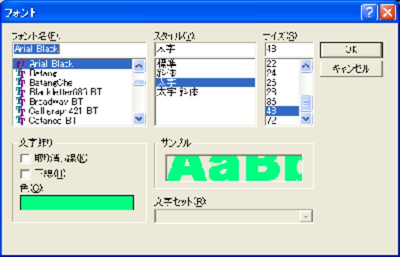 ダイアログボックスにある[フォント...]ボタンをクリックすると、文字の種類(フォント)やサイズ、色を変更できます。