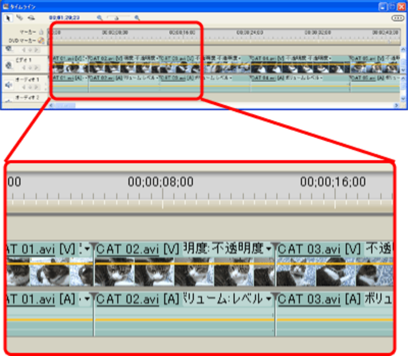 | 「タイムライン」ウィンドウ クリップの長さを調整したり、さまざまな効果を設定するためのウィンドウです。 |