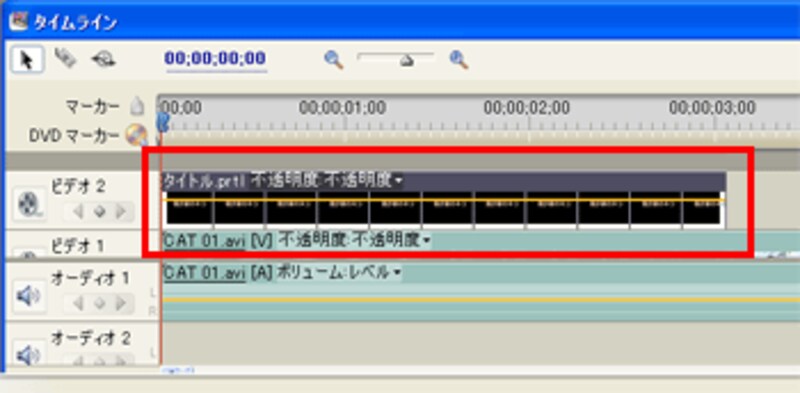 | ▲タイトルは静止画像として保存されるので、タイムラインに配置します |