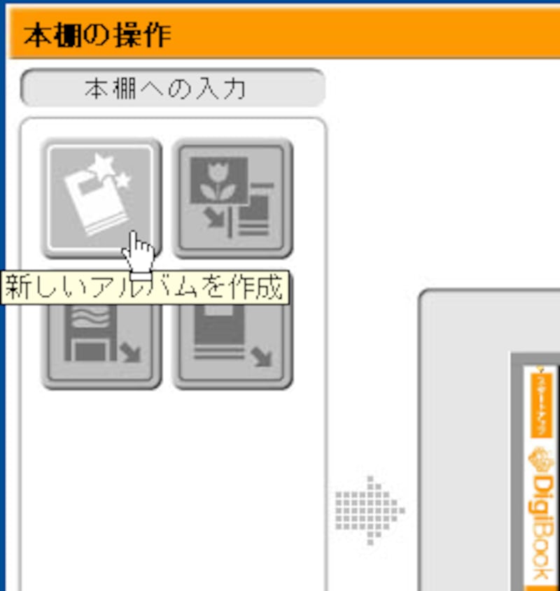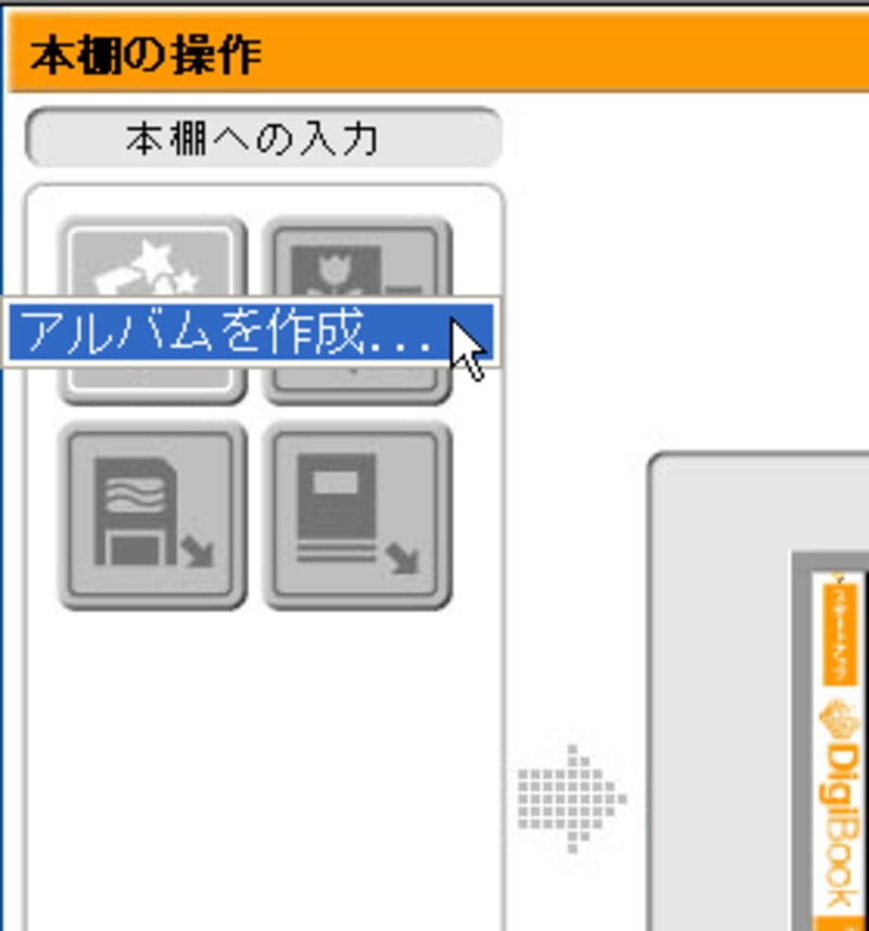 | 1.「デジブック」を起動するとこのような本棚が表示されるので、なにもないところで右クリックし、「本棚への入力」から「新しいアルバムを作成」を選択する。 |