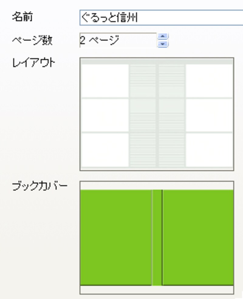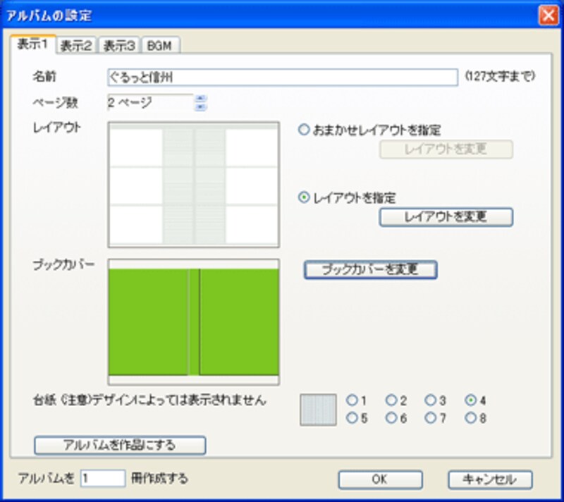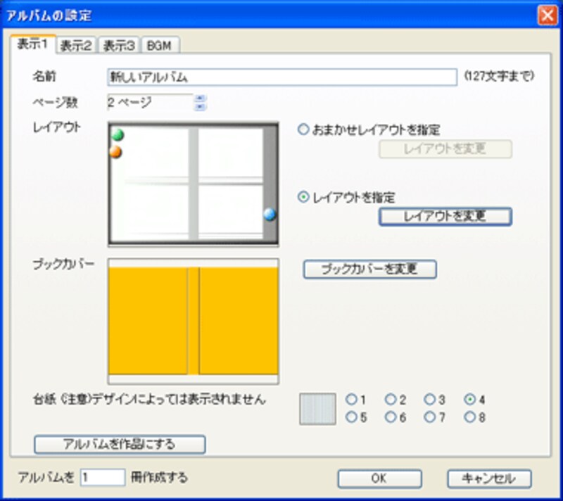 | 3.「アルバムの設定」ダイアログボックスが表示されるので、「表示1」タブにある「名前」や「レイアウト」、「ブックカバーを変更」などを設定する。 |