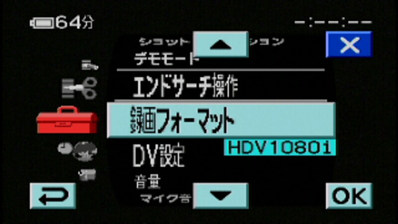 ハイビジョンらしいところがないのか、というとそんなことはありません。メニュー設定に「録画フォーマット」という項目があり、ここでハイビジョンのHDVモードと、これまでのDVタイプ(従来の撮影モード)での撮影モードとを切り換えられます。