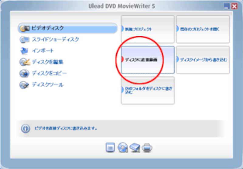 DVD MovieWriter5を起動して、「ビデオディスク」→「ディスクに直接録画」を選択します。「ディスクに直接録画」というネーミングが、作業の簡単さを予感させますね。