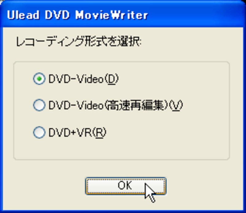 続いて、レコーディング形式を選択するダイアログボックスが表示されるので、「DVD-Video」を選択して「OK」ボタンをクリックします。