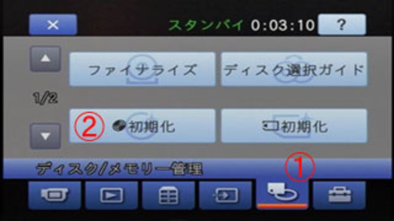 | ▲メニューから(1)「ディスク/メモリー管理」を選択。表示されたメニューから(2)「初期化」を選ふ。 |