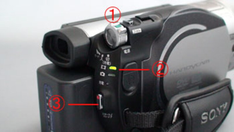 | ▲(1)ここでモードを切り替え。 (2)モードはここで確認。 (3)撮影の開始/停止はこのボタンで操作。 |