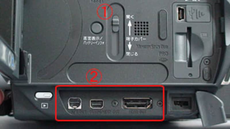 | ▲(1)このスライダーを「開く」にスライドすると、 (2)カバーが開いて端子が表れる。これもUX1と同じ。 |