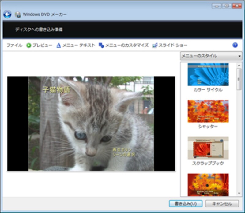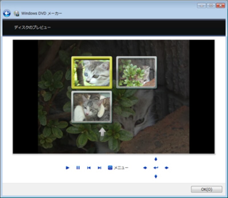 | ▲DVD-Videoを作成する、Windows DVDメーカー。これはメニューを作成する画面。 |