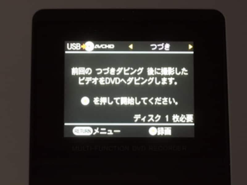 ダビング方法の「つづき」を選択すると、前回のダビング以降に記録された映像だけを検出し、ダビングを行います。1枚のDVDに続けてダビングしたい場合には便利なダビング方法です。
