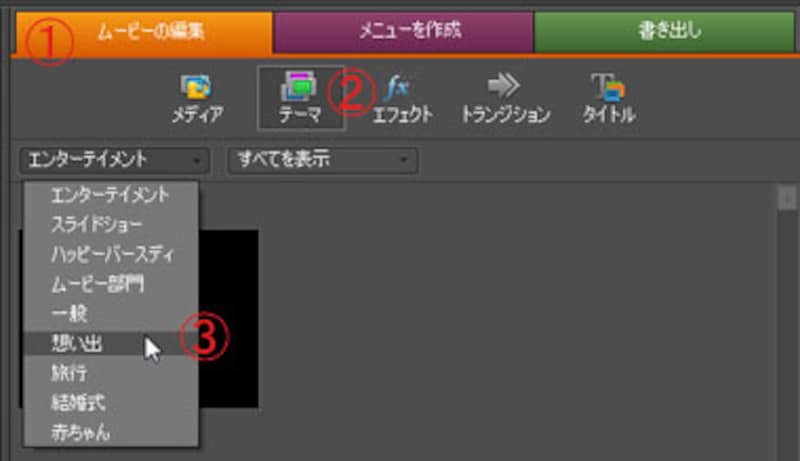 | ▲1・「ムービーの編集」を選択する 2・「テーマ」を選択する 3・テーマのカテゴリーを選ぶ |