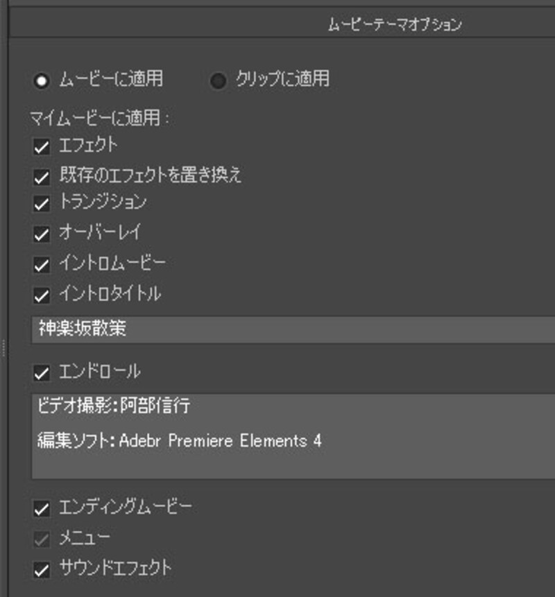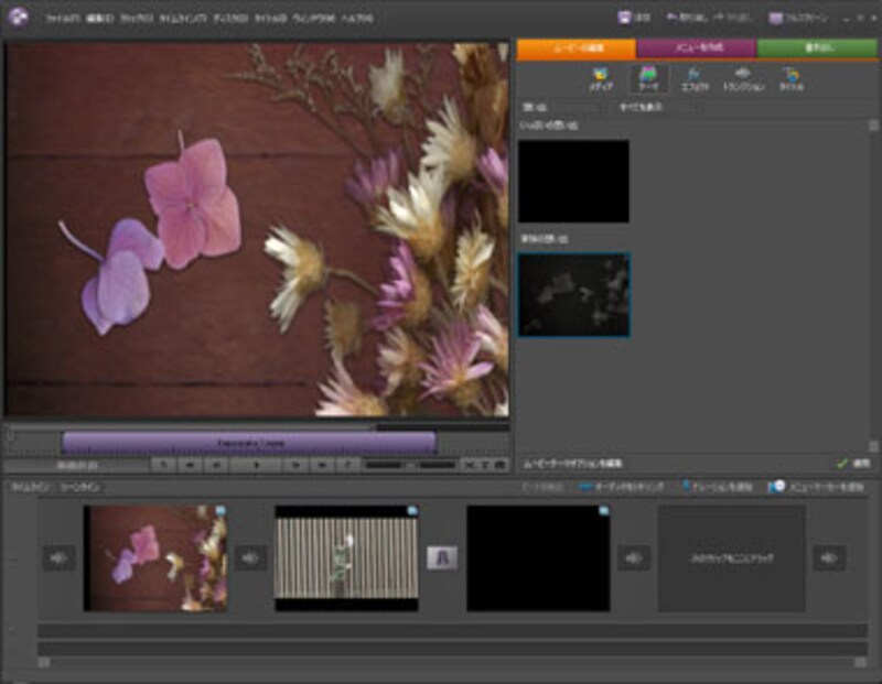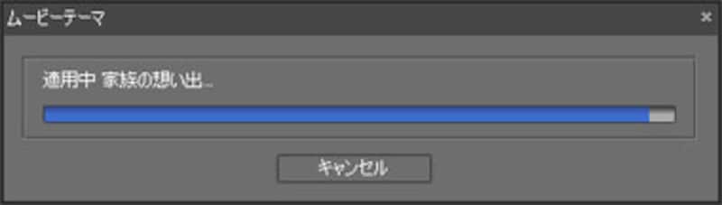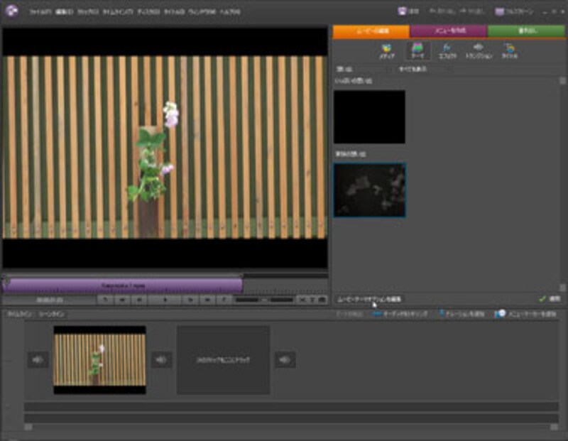 テーマを利用する場合の編集作業といえば、これだけといっても過言ではありません。テーマでは、ユーザーが何もしなくても、ムービーに必要なさまざまな効果を自動的に編集/設定してくれるのです。