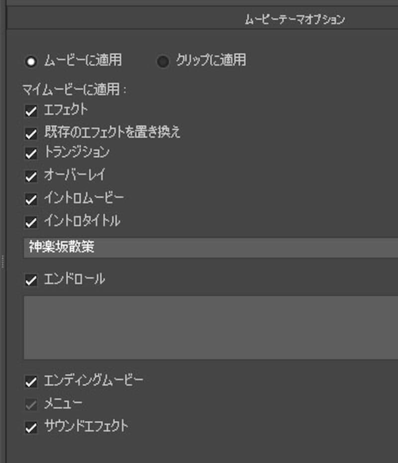 「テーマ」を利用すると、メインタイトルやエンドロールなどが自動的に設定されます。このほか、トランジションやBGMなどもすべて自動的に設定されます。そこで、メインタイトルとエンドロールの文字を入力します。