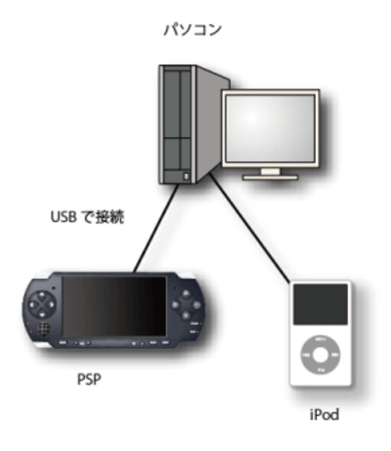 まず、PSPとパソコンをUSB接続しておきます。iPodの場合でも、同様にUSBで接続しておきます。