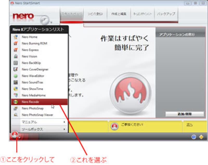 | ▲アプリケーションの「Nero Recode」を直接起動する |
