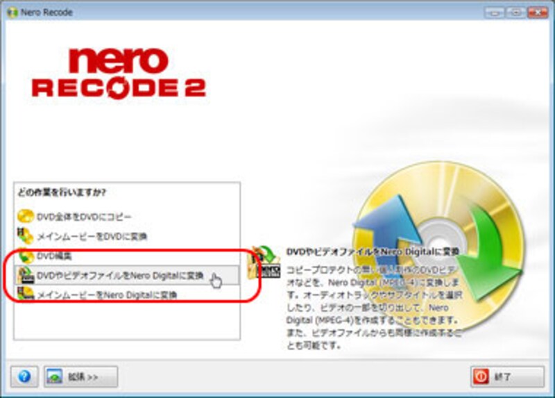| ▲「DVDやビデオファイルをNero Digitalに変換」を選択する |