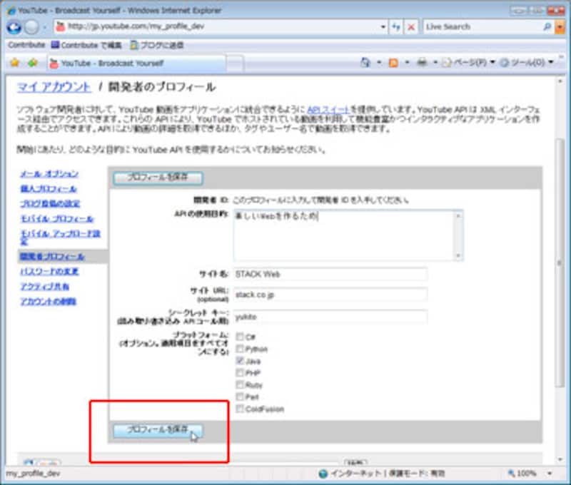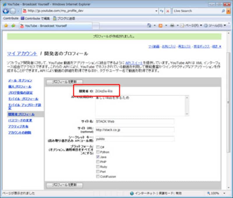 「マイ アカウント」ページの「開発者プロフィール」を開き、必要な情報を入力して「プロフィールを保存」ボタンをクリックすれば、開発者用のIDが取得できます。なお、情報は適当に入力すればOKです。