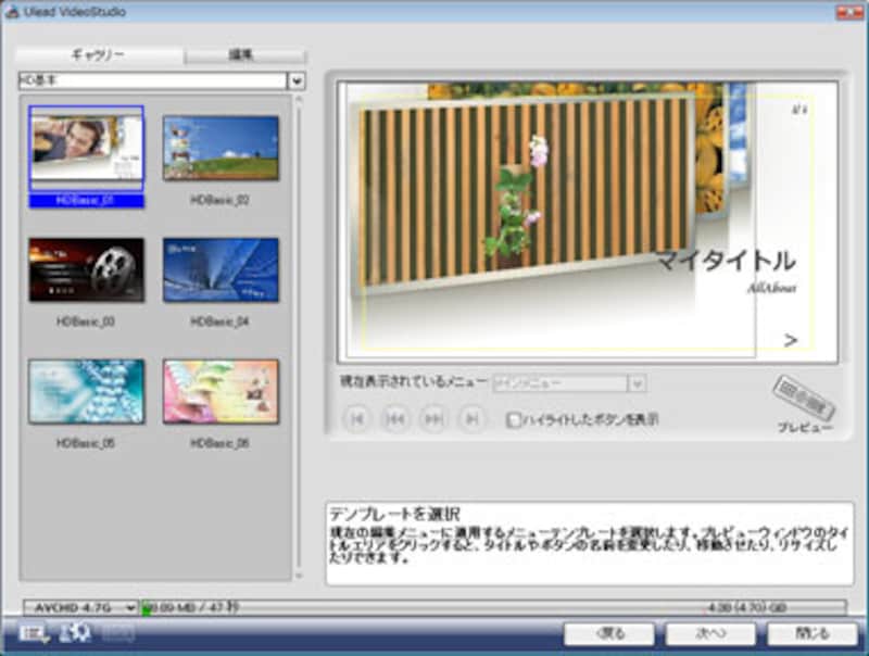 | ▲メニューの作成画面。AVCHD、Blu-ray、HD DVDとも、同じ作業画面なので、違和感なくオーサリング作業が行える (画面クリック) |