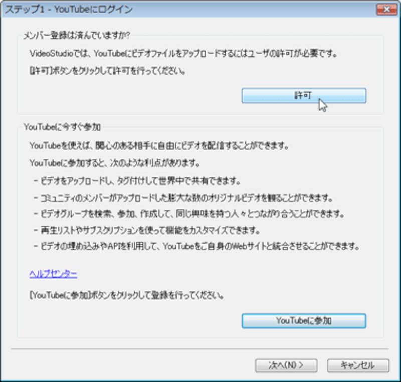 | ▲YouTubeへは、「許可」ボタンをクリックしてアップロードを行う |