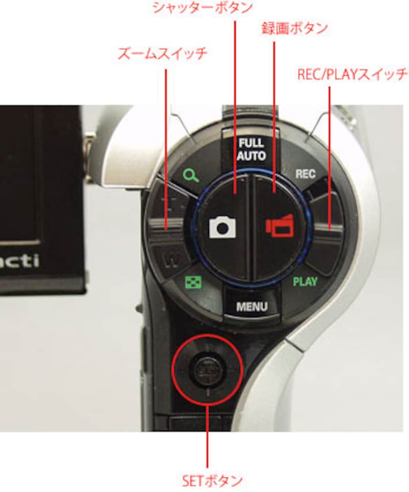 また、「REC/PLAYスイッチ」がPLAY側にあれば、「SET」ボタンを左右に押して再生/表示する写真やムービーを切り替え、「SET」ボタンを押せばムービーが再生されます。