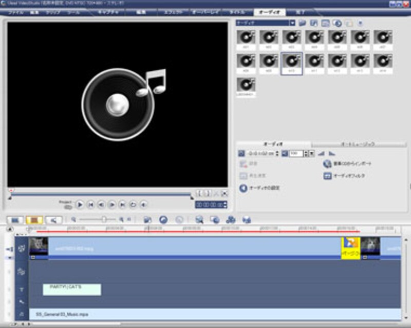 ちょっとカッコイイムービーを作りたいので、BGMも設定。BGMも、VideoStudio 11に標準添付されているオーディオクリップを利用してみました。