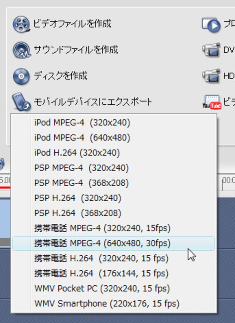 最後の出力作業が 完了ステップ です。ここで「モバイルデバイスにエクスポート」を選択し、プルダウンメニューから「携帯電話 MPEG-4(640x480,30fps)」を選択しました。「320x240,15fps」やH.264でもよいのですが、今回は画質を重視したいので、ちょっと大きめの画面サイズのテンプレートを選んでみました。