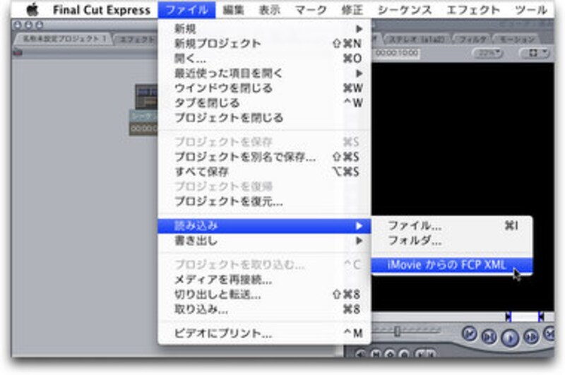 Final Cut Express 4では、iMovie '08のプロジェクトを読み込み、そのまま利用することができます。ただ、今回試したところ、オンラインマニュアルの手順では読み込むことができませんでした。そこで、ここでもう1つ紹介されていたiMovieのプロジェクトをXMLファイルとして出力する方法で読み込みました。