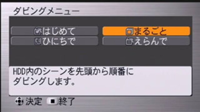 ダビングの方法には、「はじめて」、「まるごと」、「ひにちで」、「えらんで」など、目的に応じてダビング方法を選択できます。ここでは、撮影した映像をすべてダビングする「まるごと」を選択してみましょう。