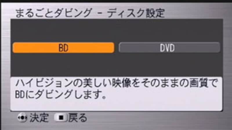 | ▲ダビング先のディスクには、Blu-rayディスクとDVDどちらかが選択できる。 |