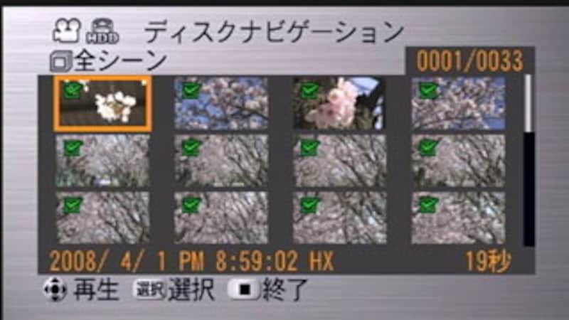 撮影した映像は、本体横の「ディスクナビゲータ」ボタンを押すとサムネイルメニューが表示されるので、ここから選択して液晶モニターで確認できる。