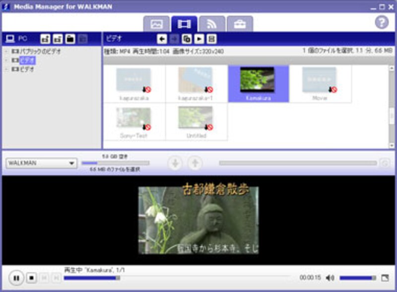 | ▲起動した「Media Manager for WALKMAN」。ビデオの再生も可能。 |