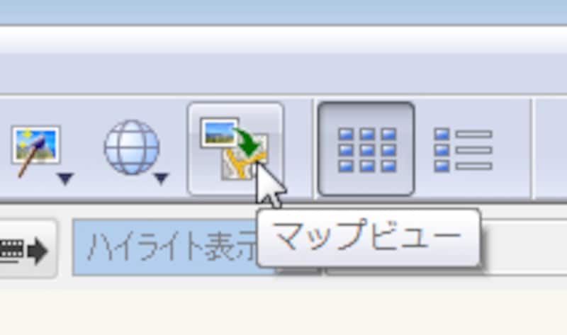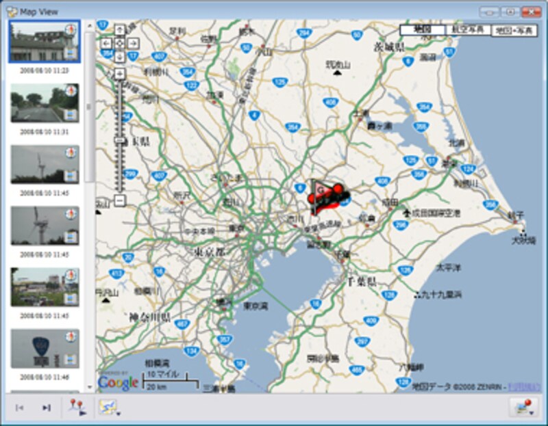 PMBのサムネイルに、位置情報が関連付けられたことを示すコンパスのマークが表示されます。このマークを確認し、ツールバーにある「マップビュー」アイコンをクリックします。これで、マップビューが表示されます。なお、マップビューのマップ情報は、Googleを利用しています。なお、インターネットに接続していない環境では、付属のマップデータ「Super Mapple Digital Ver.7 for Sony」が利用できます。