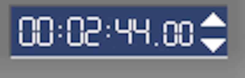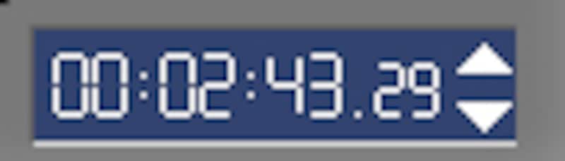 動画のように時間を物差しとして考える場合、時間の経過が「時間軸」になります。動画編集では、これを「タイムコード」と呼んでいます。動画を編集していると、画面のような時間を表示するエリアがありますが、これがタイムコードです。タイムコードは、現在、どの位置の映像が表示されているかを示したり、動画の再生時間や編集位置などを示すのに利用されています。たとえば、下の画面の場合、タイムコードは「00:02:43:26」と表示されていますね。この場合、現在の表示位置は、2分43秒26フレーム目の位置だということを示しています。
