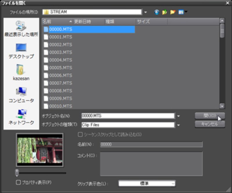 | ▲ハードディスクにあるAVCHD形式のファイルを選択し、「開く」ボタンをクリックする。 |