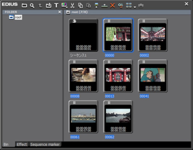 EDIUS Pro 5では、素材映像などを管理するパネルを「ビン」といいます。このビンに、ハードディスクにあるAVCHD形式の映像を読み込みますが、登録した素材は、「クリップ」と呼ばれます。