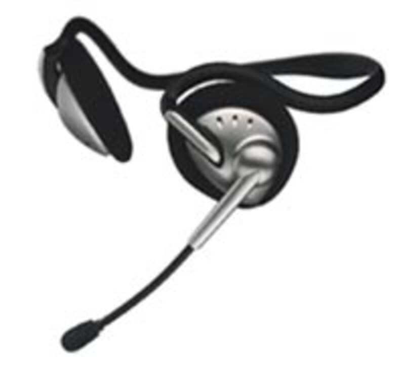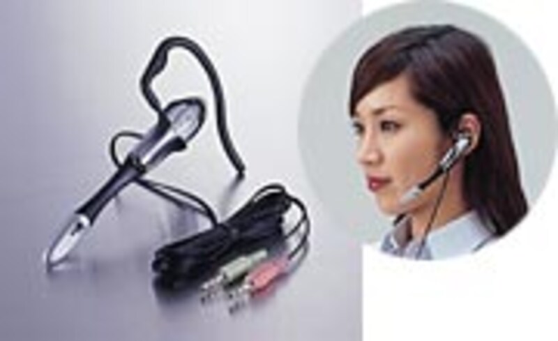 左のネックバンド型のヘッドセットはロジクール社製。これなら、装着時にヘアスタイルを崩してしまうこともないだろう。また、音声会話以外の時には、マイク部分を邪魔にならない位置に引っ込めてしまえば、そのままパソコンで音楽を楽しむのに使っていても、あまり違和感がないデザインになっている。
