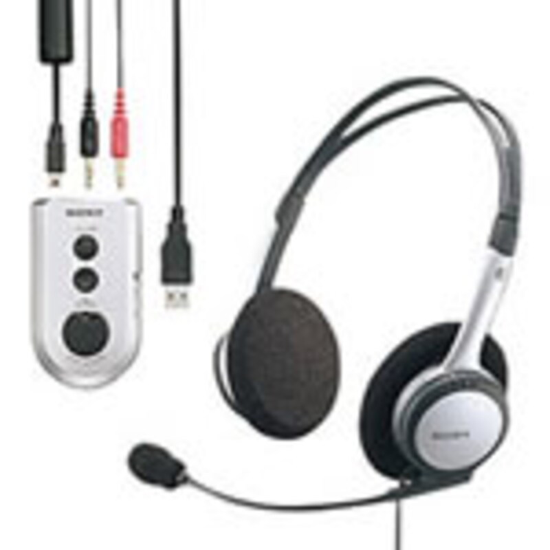 多くのヘッドセットは、ステレオミニプラグでパソコンに接続するようになっているが、USBで接続するデジタル伝送方式採用のヘッドセットもある。左のソニー製のヘッドセットなどは、少々値段は高くなってしまうものの、高音質の他、ボリュームのコントロールも手元でできるなどいろいろ機能面で特徴をもっている。