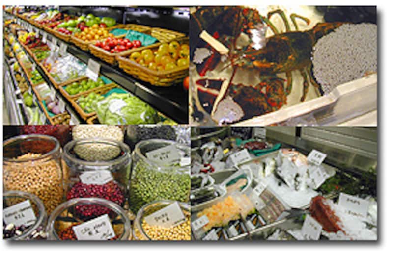 ![]() この日は「アロエの芽」もあった新鮮野菜たち(左上)と ビーンズ(左下)。鮮魚売り場には生きたロブスター(右上)も!! |