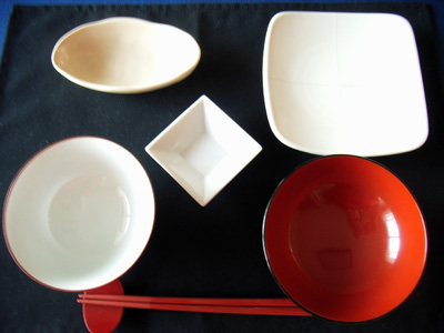 飯碗、汁椀、箸、菱形変形中鉢、丸小皿、五角形小鉢