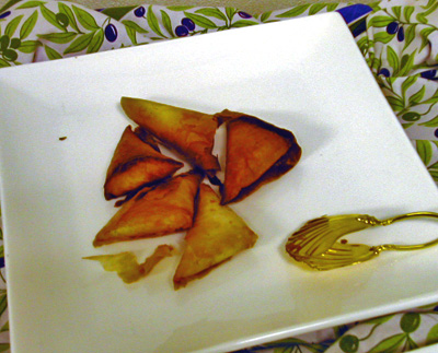 チーズを具にして油で揚げると聞いて、チーズをワンタンの皮で巻いて揚げたような味を想像してしまいましたが、試食してみると意外にさっぱりしていました。「フィロシート」はとても薄いので、揚げても油っこくなく、中のチーズもとろりととけていて、これがとてもおいしくて、ワインにもビールにも合います。ワイワイお喋りしながらどんどんすすんでしまいそうな一品です。