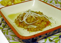 ギリシャ料理は、ディップの種類が大変多く、このナスのディップは、米ナスをグリルして皮をむき、角切りにしたトマト、パセリ、にんにく、ビネガー、オリーブオイルなどで和えて作ります。ワインと一緒に、パンにのせていただきます。