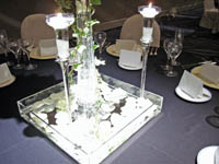 | トピアリーの花器の下には、正方形のガラスの容器が置かれています。 |