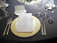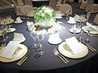 テーブルには無彩色のクロスをかけています。花は白と淡いグリーンでさわやかにまとめています。シンプルでスタイリッシュ、都会的なコーディネートです。写真でおわかりでしょうか、会場のライティングにも工夫が凝らされています。流れている音をお伝えできないのが残念ですが、会場の雰囲気に合った音楽あるいは新郎新婦の好みの音楽を流すそうです。テーブルコーディネートとフラワーアレンジメントに光と音楽を加えて、空間を総合的にプロデュースした豪華な披露宴会場です。![]() |