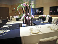 テーブルクロスは、紺色と白を交互にかけています。高さのある竹の花器を大胆に使って空間的広がりを表現すると同時に、テーマであるアジアのイメージを強調しています。茶色の竹の花器がアジアのイメージを演出します。高い花器と低い花器の高低がここでも会場にリズムをもたらします。