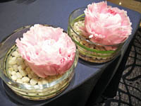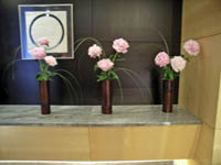 | 背の高い竹の花器にシャクヤクの花を生けてセンターに飾る。* 画面をクリックすると拡大画面が見られます。 |