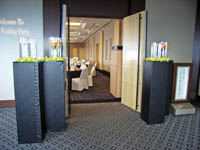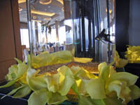 ウエディング会場入り口から会場全体まで、今回の食空間演出は、あらゆるところに細かい心くばりが感じられました。クロス、ナプキン、食器(皿、グラス、カトラリー)、メニューカード、ネームカード、座席の椅子カバー、 花、花器、キャンドル、照明、音楽等のコーディネート。どれもが、バランス良く、うまくコーディネートされて、初めて人に感動を与えます。是非、ホームパーティで、お手本にできるアイディアをとりいれてみてください。