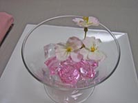 食前酒のかわりに、桜のリキュールゼリー寄せをお出しします。スプーンを添えるとよいでしょう。散歩から帰ったあとは、冷たく冷やしたゼリーは美味しいものです。特に、女性の方には大人気です。また、桜のリキュールゼリー寄せではなく、ピンクシャンパンを食前酒にすることもできます。前菜として、雲丹と蟹のゼリー寄せをお出しすれば、男性の方にも喜ばれます。