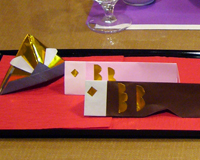 テーブルマットとして、端午の節句のイメージカラーの紫色の和紙を選び、そこに白の紙を少しずらして重ね、コントラストの違いがかもし出す雰囲気を楽しみます。ナプキンは菖蒲の葉の色と同じ緑です。お節句なので、少しあらたまった柳の祝い箸を使います。白木の柳の祝い箸はお正月の祝い膳だけではなく、節句の時にも使います。このように、ちょっとした工夫をこらすだけで、お祝いの食卓らしくなります。子供たちにとっても、新鮮な思い出になることでしょう。
