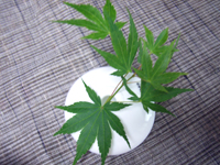 まだ葉が青い紅葉が、和食によく合います。今回は、小さい白いガラスの花器に生けてみます。花器の白は紅葉の青さを強調し、葉の青さが戸外の自然のさわやかさ、涼やかさを感じさせてくれます。