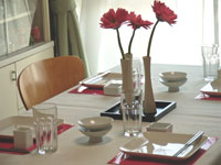 上の写真のように、花を3本飾っただけで、お誕生日などちょっとしたお祝いのテーブルにも使えます。また、ガーベラの花3本の飾り方、置き方には次にご紹介する応用パターンでいろいろな雰囲気を創り出すことができます。![]() |